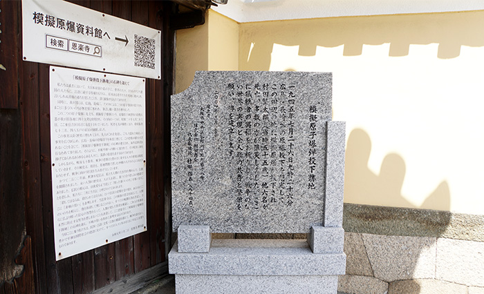 太平洋戦争末期、米軍は全国約50カ所で原子爆弾を落とす訓練を行っていました。1945年7月26日、東住吉にプルトニウム原爆と同形・同重量の模擬原子爆弾が投下され、死者7人・負傷73人・家屋485戸焼失の被害が出ました。本物だったら、大阪の街は全壊して10万人以上の死者が出たのではないかと言われています。