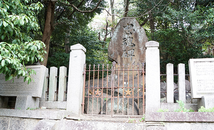 四條村忠魂碑は、西南戦争以後の戦争で戦死した四條村(現在の大東市東部)出身者の慰霊碑として建てられたもので、両脇にある「殉国之英霊碑(じゅんこくのえいれいひ)」には日中戦争、太平洋戦争で戦死した277人の氏名が刻まれています。靖国神社と同じく、「英霊」としてまつられています。