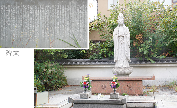 大阪大空襲で犠牲になった人を慰霊する観音様。いっしょに添えられている「碑文」は6月7日にこの地で起きたことが「鮮明」に記されています。「真実を教え、真実を語り、真実を伝え、この惨劇の歴史と、ここに刻みこまれた犠牲者とともに永久に銘記するものである」と訴えています。