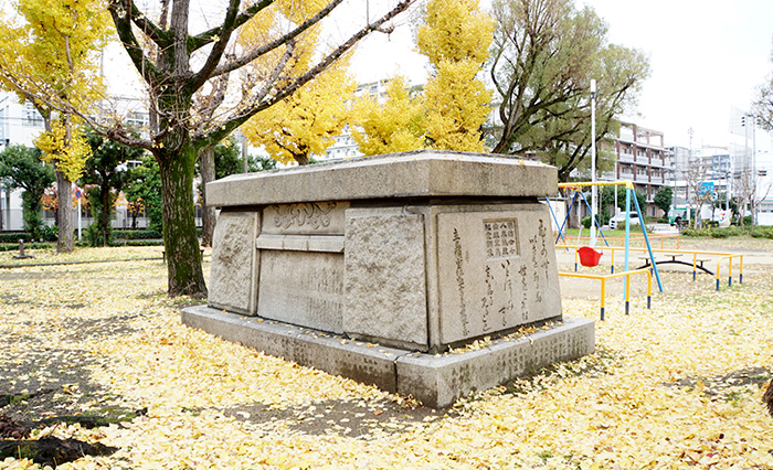 築港南公園にある巨大な台座には、かつて青銅製の馬の像が乗っていました。日露戦争に出征した軍馬の慰霊のために1909年(明治42年)に中之島公園に建てられましたが、後に馬たちが船に乗降した大阪港に近いこの公園に移設。その後、戦況悪化により武器生産に必要な金属資源が不足したため1941年(昭和16年)に金属回収令が出され、回収されたと言われています。