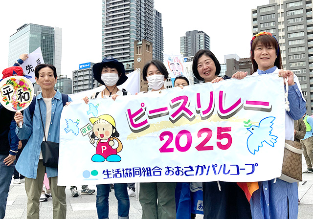 ピースリレーは、生協の組合員さんが「平和の尊さ」「核兵器廃絶」を広く社会に訴える行動として1970年代から始まりました。平和を考える機会として市民に呼びかけながらみんなで大阪の街を歩いています。