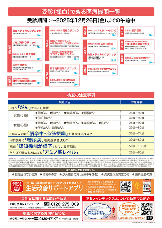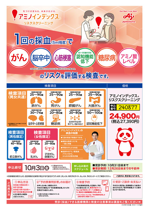 1回の採血(5ml程度)で「がん」「脳卒中」「心筋梗塞」「認知症低下」「糖尿病」「アミノ酸レベル」のリスクを評価する検査です。