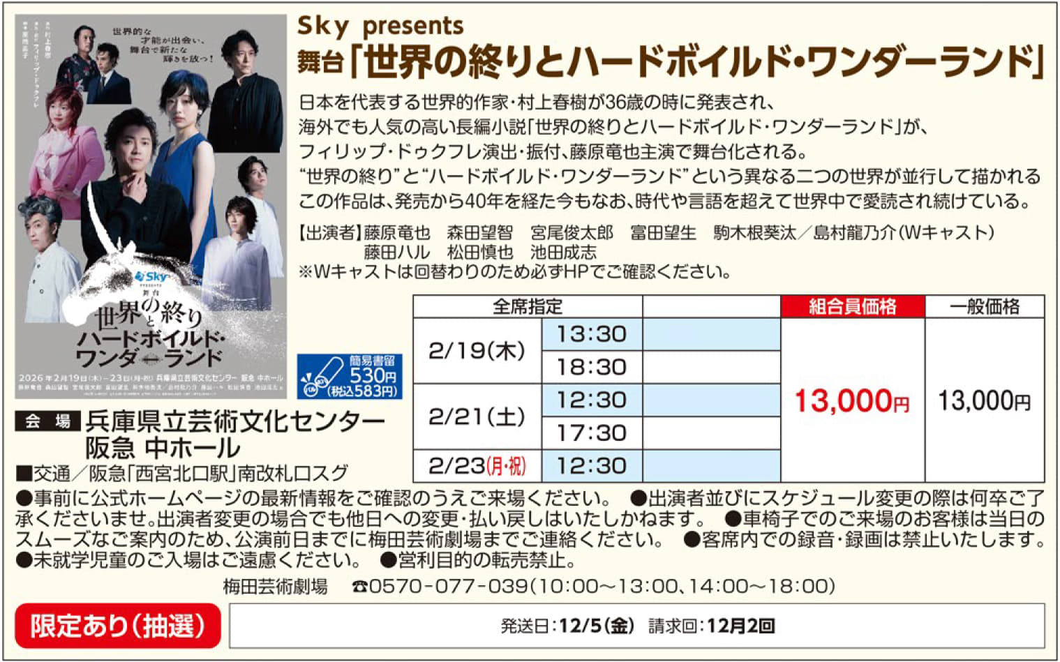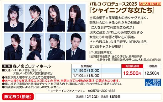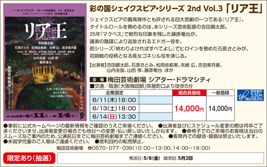 株式会社梅田芸術劇場 シアタードラマシティ 06-6377-3888 https://www.umegei.com/schedule/1202/ |