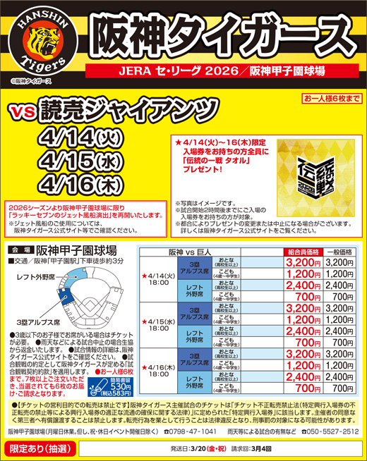 6/1回 | 試合が開催される場合は返金対応なし | 阪神甲子園球場 050-5527-2512 https://koshien.hanshin.co.jp/ |