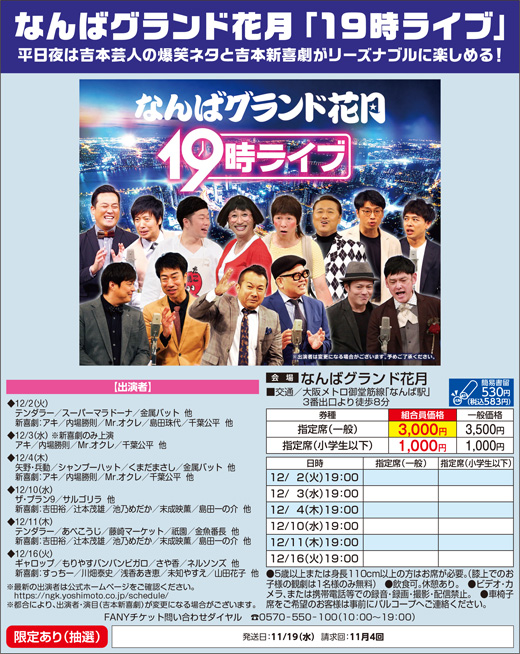 よしもと団体専用番号 0570-064-489(10時~18時) https://yoshimoto.funity.jp/calendar/gion/ |