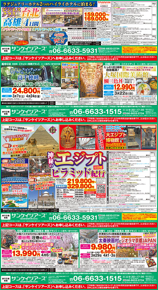 ご予約はサンケイツアーズへ直接お電話ください。ご予約・お問い合わせ TEL 06-6633-1515