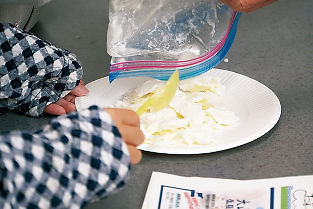 牛乳・生クリーム・砂糖を入れたジッパー付き保存用袋を、さらに氷と塩を入れた袋に入れて、15分〜30分シャカシャカ振ると、中身が固まってアイスクリームの完成!