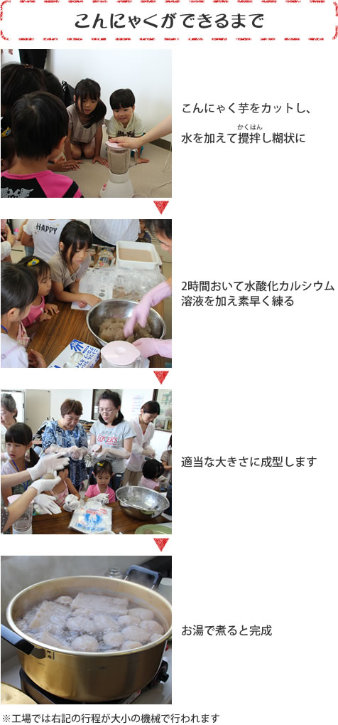 "こんにゃくができるまで"を、知ろう、体験しようと、夏休みの子どもたちも一緒に(株)若草食品へ。工場の見学や学習の後、こんにゃく作りを体験。みずみずしい香りの生のこんにゃく芋が、だんだんいつも食べているこんにゃくに。 できたての温かいこんにゃくをおいしくいただきました。