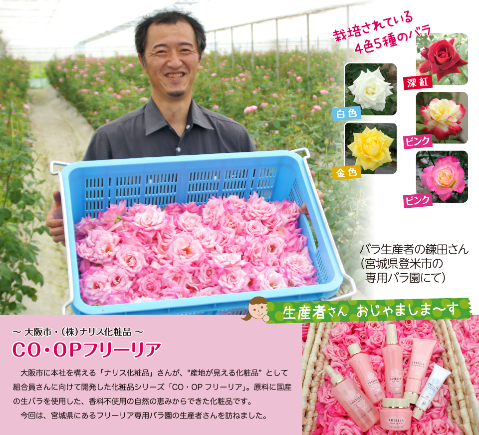 CO・OPフリーリアの特長であるモダンローズの香りは、ナリス化粧品オリジナルの蒸留方法によるもの。生バラそのままの香りのローズ水配合だから、ふんわり柔らかい香りの化粧品になるんです。