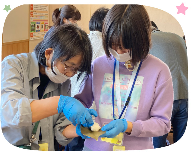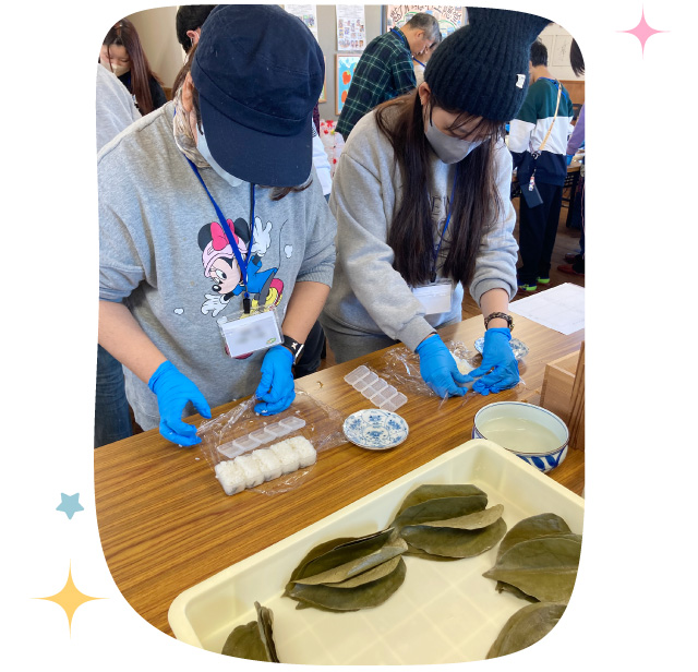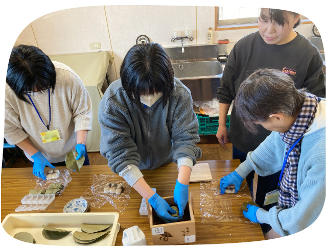成形したサバ寿司を柿の葉で巻いていきます。柿の葉の巻き方が難しく、みなさん真剣です!