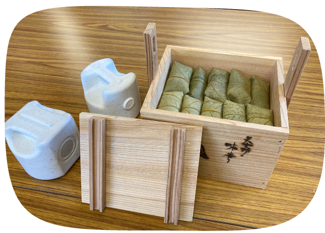 柿の葉で巻いた寿司を木箱に隙間なく入れ、重石を乗せて、味がなじむまでしばらく置きます。