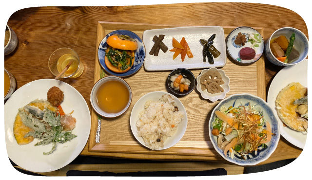 築150余年の王隠堂家の邸宅を開放した古民家レストランで、珍しい柿の天ぷらや柿サラダ・柿の佃煮など柿ずくしの昼食をいただきました。