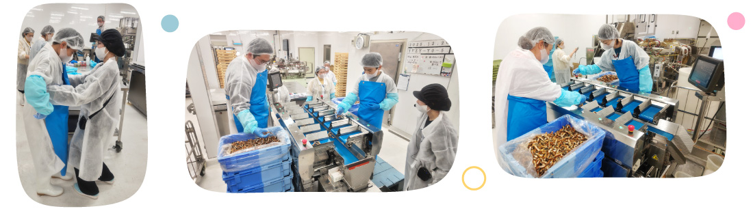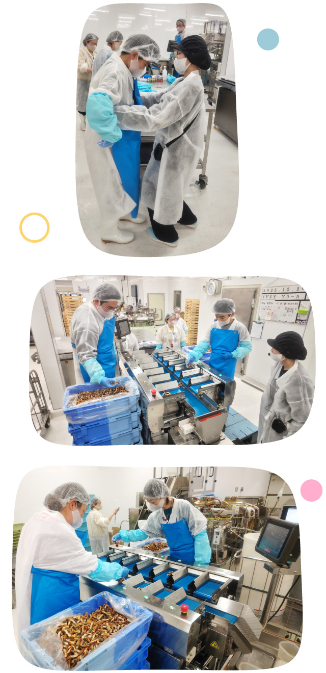 目分量で手で投入したものを、機械が自動計量してちょうど良い分量に合わせていきます。投入量が多すぎたり少なすぎたりしないように集中・・・。