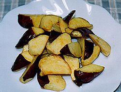 鍋にあら熱をとった1のイモを並べ砂糖、サラダ油を入れ火にかける。フタをして中火で3分。ひっくり返して叉、フタをして3分位。砂糖がアメ状になっているのでからめる。(砂糖がこげない様に気をつける)