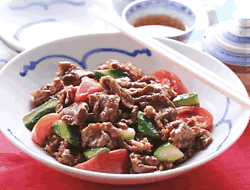 きゅうりは皮をところどころむいて乱切りにし、トマトはくし形に切る。