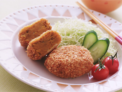 1に3を加えて混ぜ、4等分にして形を整える。小麦粉、溶き卵、パン粉の順に衣をつけ、170度の油で揚げる。 |