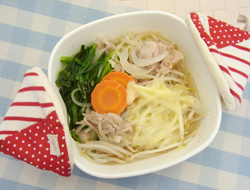 鍋に(A)を入れてひと煮立ちさせ、豚バラ肉と野菜を加えて、ふたをして蒸し煮する。