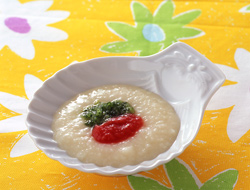 小鍋にゆでうどん、だし汁を入れて柔らかくゆで、裏ごしする。