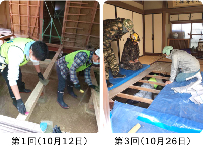 10月から12月にかけて毎週末、災害支援ボランティアとして呉市で活動しました。2泊3日で3人ずつ、現地で復興支援をされている「コミサポひろしま」さんの活動に参加。床下浸水したお宅の床下に入り泥出しをしたり、部屋に入り込んだ土砂を掻き出すなどの作業を行いました。