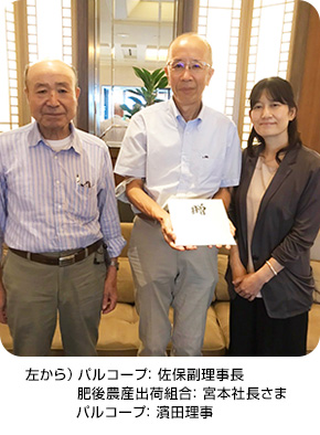 普段から取引のある産地で被害にあわれた肥後農産出荷組合さまへ、パルコープの理事が訪問し贈呈しました(9月23日)。