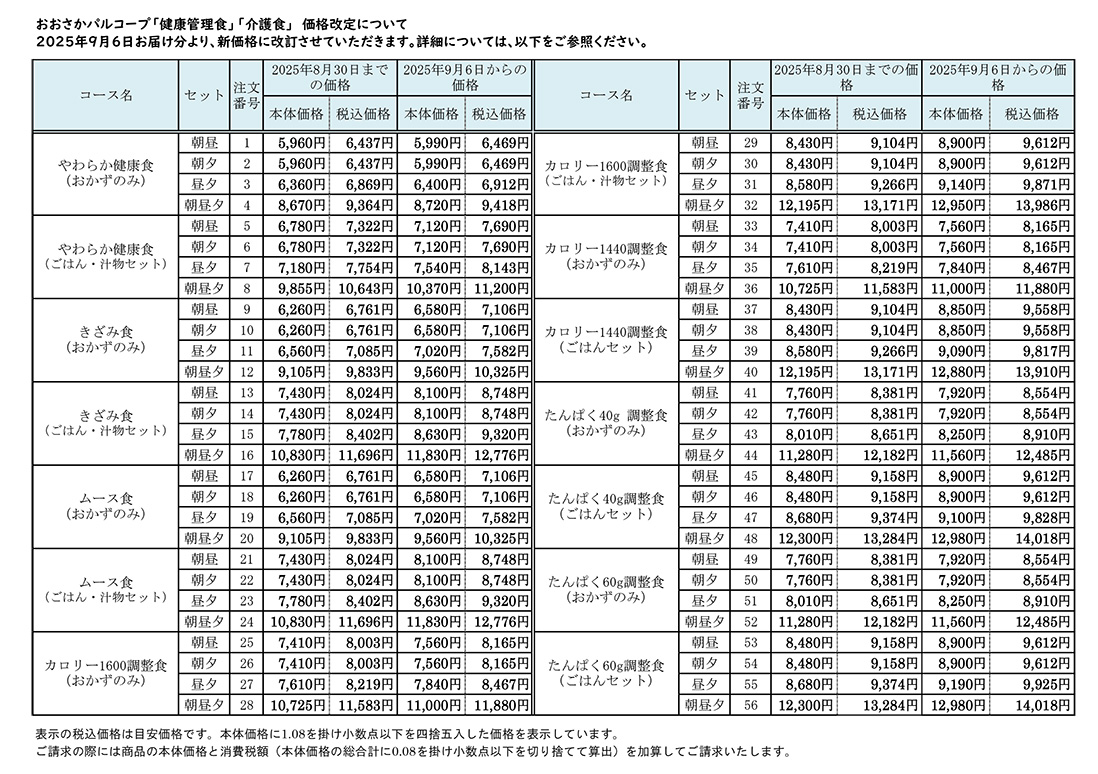 この度、原材料価格やエネルギーコスト高騰などの影響を受け、下記のとおり価格改定させていただく事となりました。組合員の皆さまには何卒ご理解を賜り、今後とも末永くご利用いただきますようお願い申し上げます。