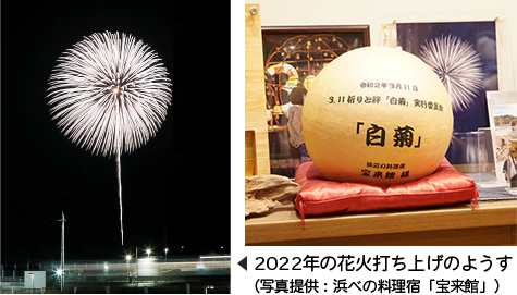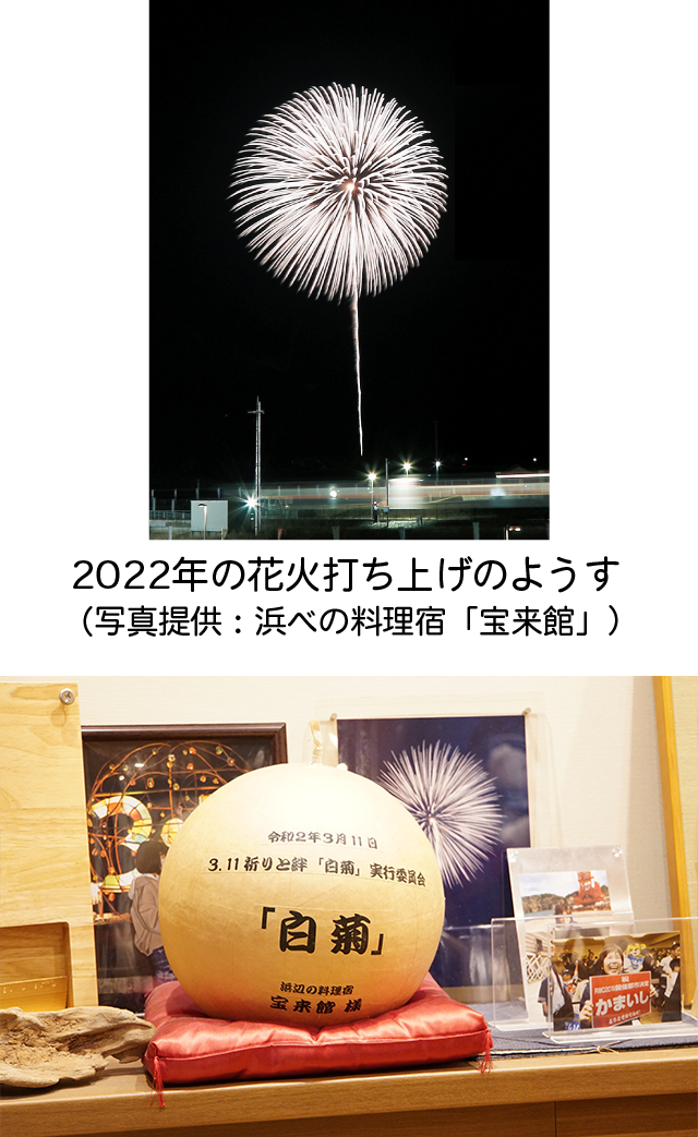 昨年は、3月11日からの延期を経て7月12日に打ち上げられましたが、今年も3月11日に、東日本大震災津波の犠牲者、能登半島地震・豪雨で亡くなった方たちを弔うため「白菊」を打ち上げます。