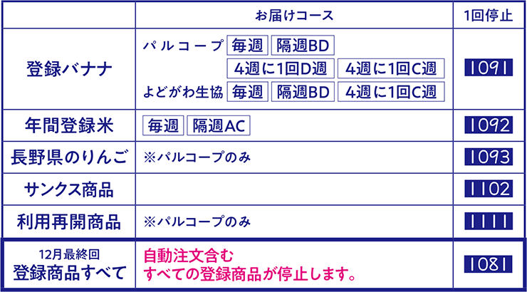 ※一括ストップすると、「新規加入サンクス」「利用再開」の商品もお届け停止となります。