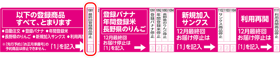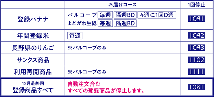 ※一括ストップすると、「新規加入サンクス」「利用再開」の商品もお届け停止となります。
