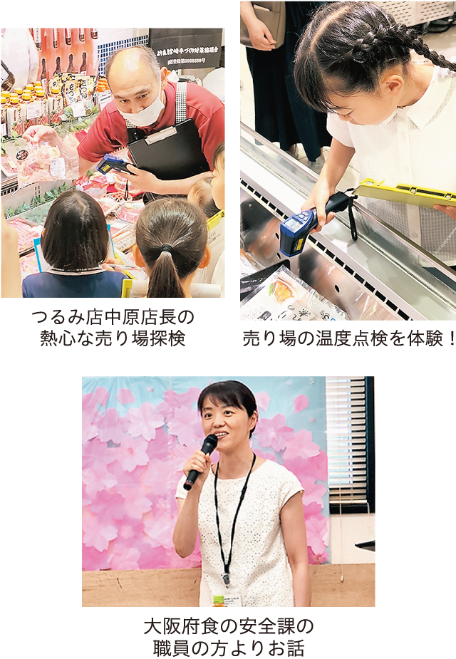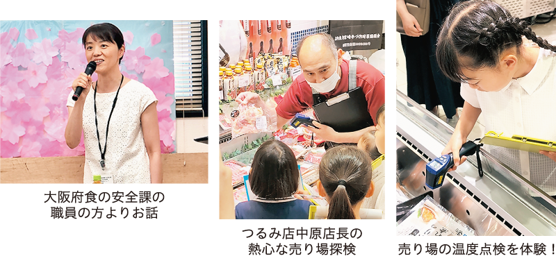 つるみ店2階集会室にて「食の安全安心学習会」を開催し、小学生19名と保護者14名、合計33名に参加いただきました。当日は3つのグループに分かれ、売り場探検やバックヤード探検、手洗い検査(ブラックライト実験)を行いました。
