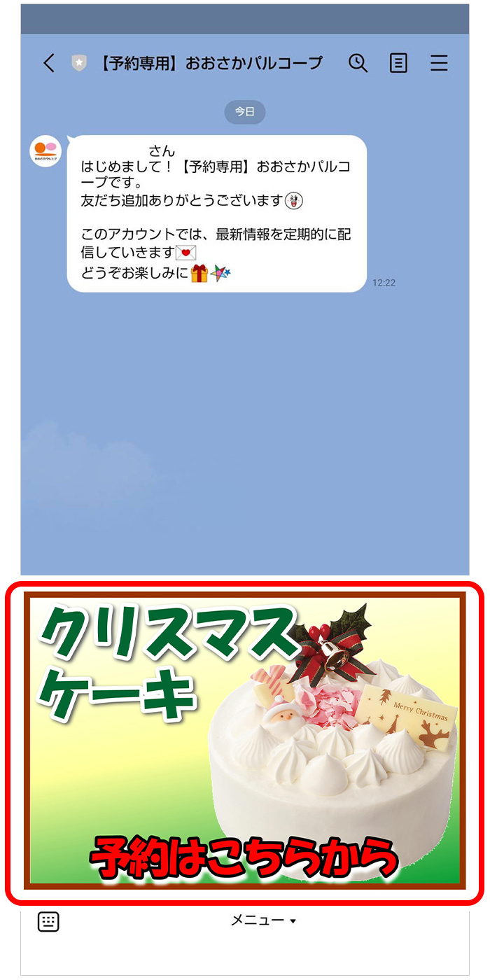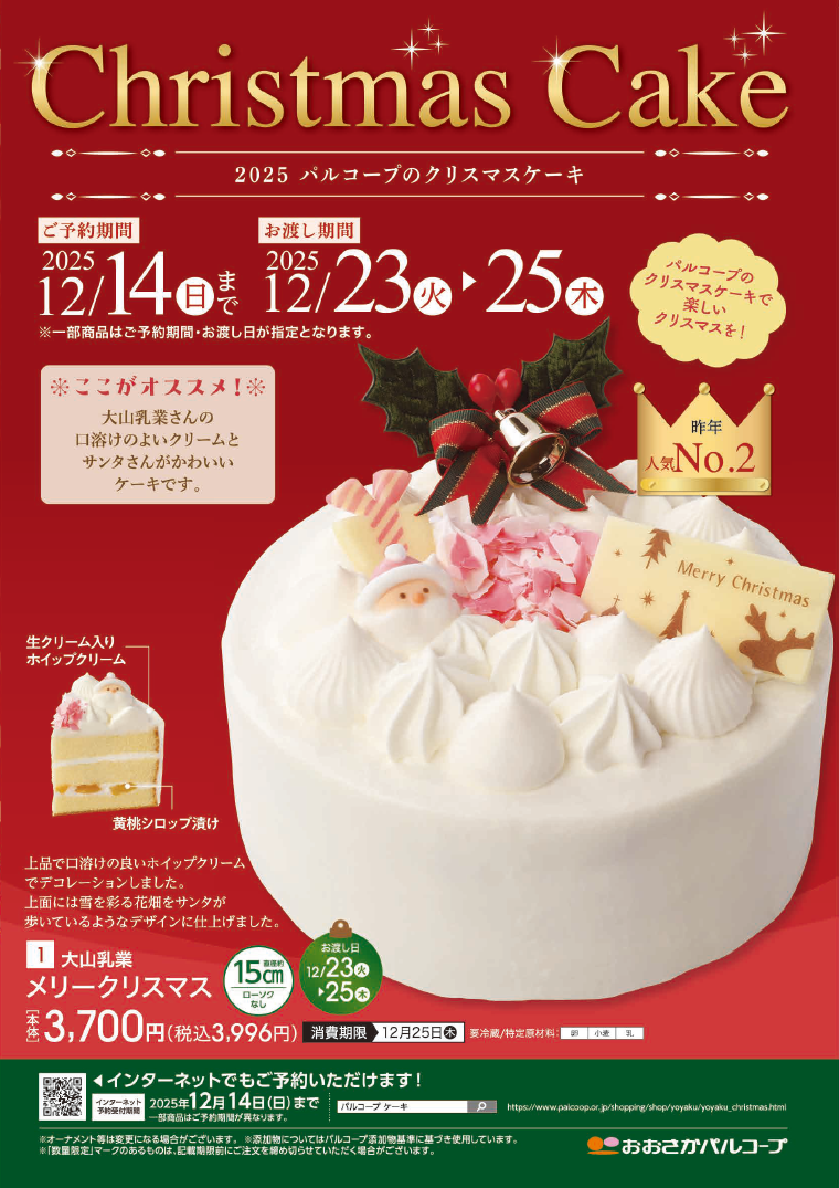 おおさかパルコープ店舗のクリスマスケーキご予約案内です。